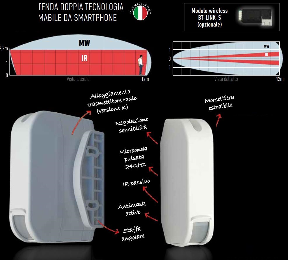 Pet immunity per effetto di algoritmo di analisi digitale che consente il filtro delle masse rilevate. Programmazione e taratura dei parametri di sensibilità regolabile tramite APP / Tablet / PC (richiede BT-Link-s non incluso).